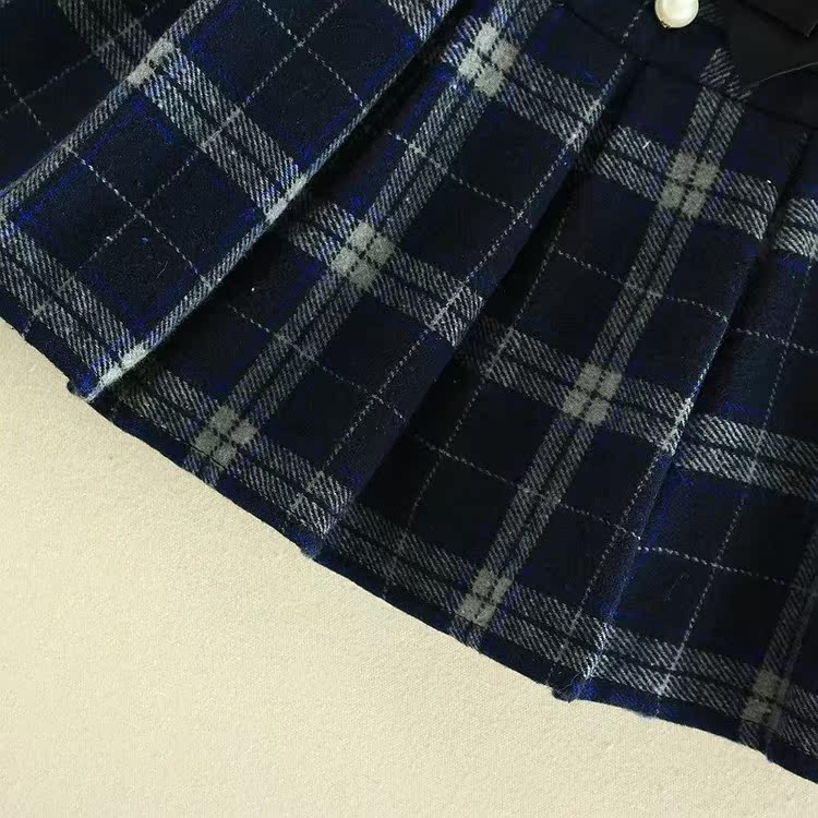 S8078 秋裝新款韓版時尚珍珠扣格子百褶款松緊腰毛呢短裙女