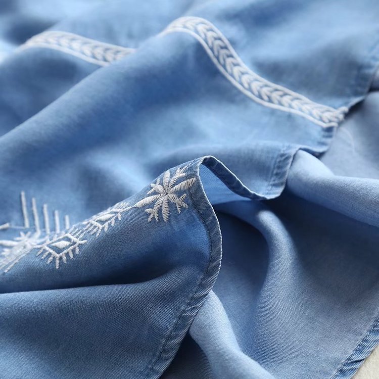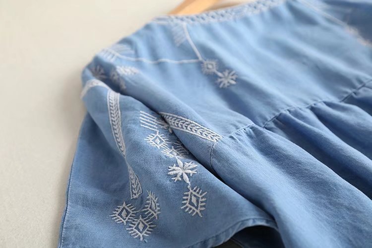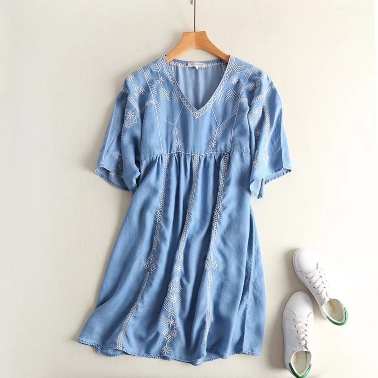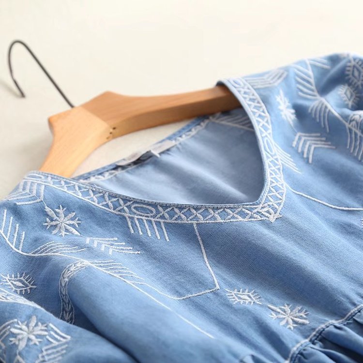 夏季新款民族風刺繡V領拼接插肩中長款牛仔天絲連衣裙女AP4493
